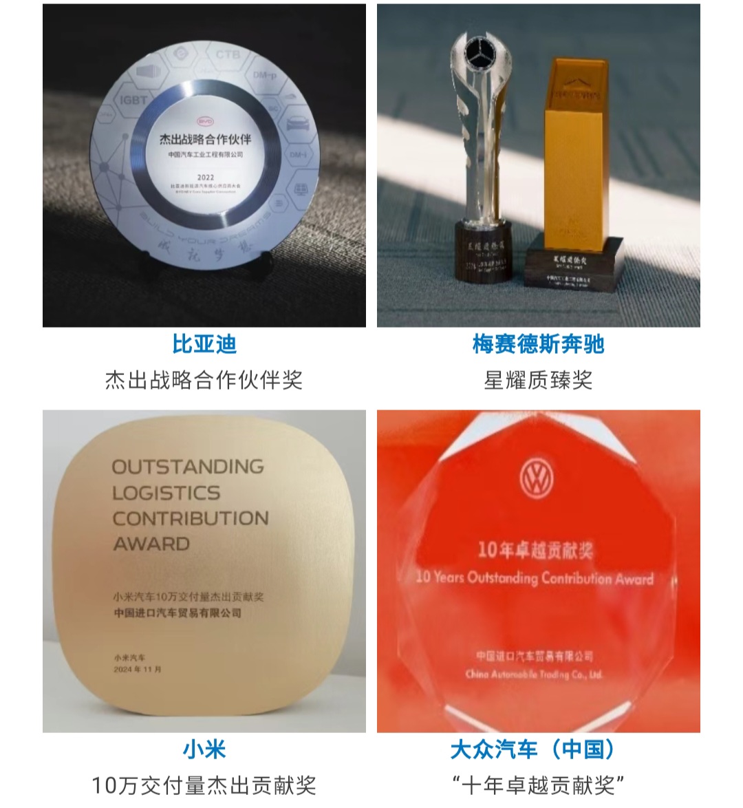 屡获客户高度评价:比亚迪“杰出战略合作伙伴奖”、梅赛德斯奔驰“星耀质臻奖”、大众汽车(中国)“十年卓越贡献奖”、零跑汽车年度“最佳服务奖”。